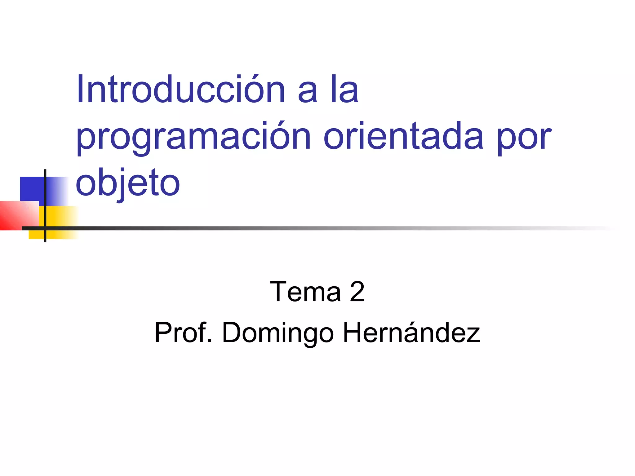 Este documento presenta una introducción a la programación orientada por objetos. Explica conceptos clave como clases, objetos, atributos, métodos, herencia y polimorfismo. También describe las diferencias entre la programación convencional y la orientada a objetos, donde los objetos encapsulan datos y comportamientos. El profesor Hernández introduce estos temas para explicar los fundamentos de este paradigma de programación.