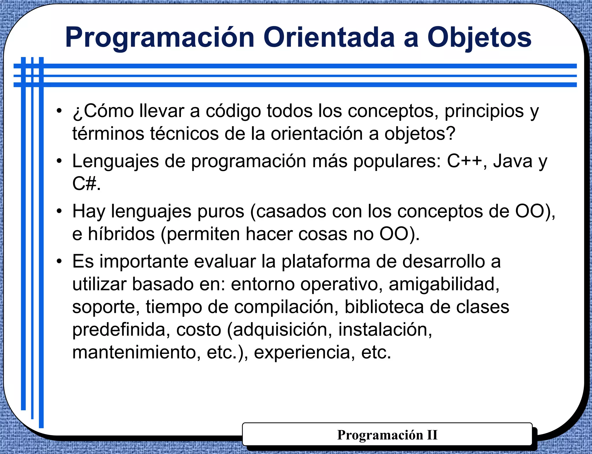 Este documento presenta los conceptos básicos de la programación orientada a objetos y compara tres lenguajes de programación populares que soportan este paradigma: C++, Java y C#. Explica cómo se definen clases y métodos en cada lenguaje, así como cómo crear instancias u objetos de una clase.