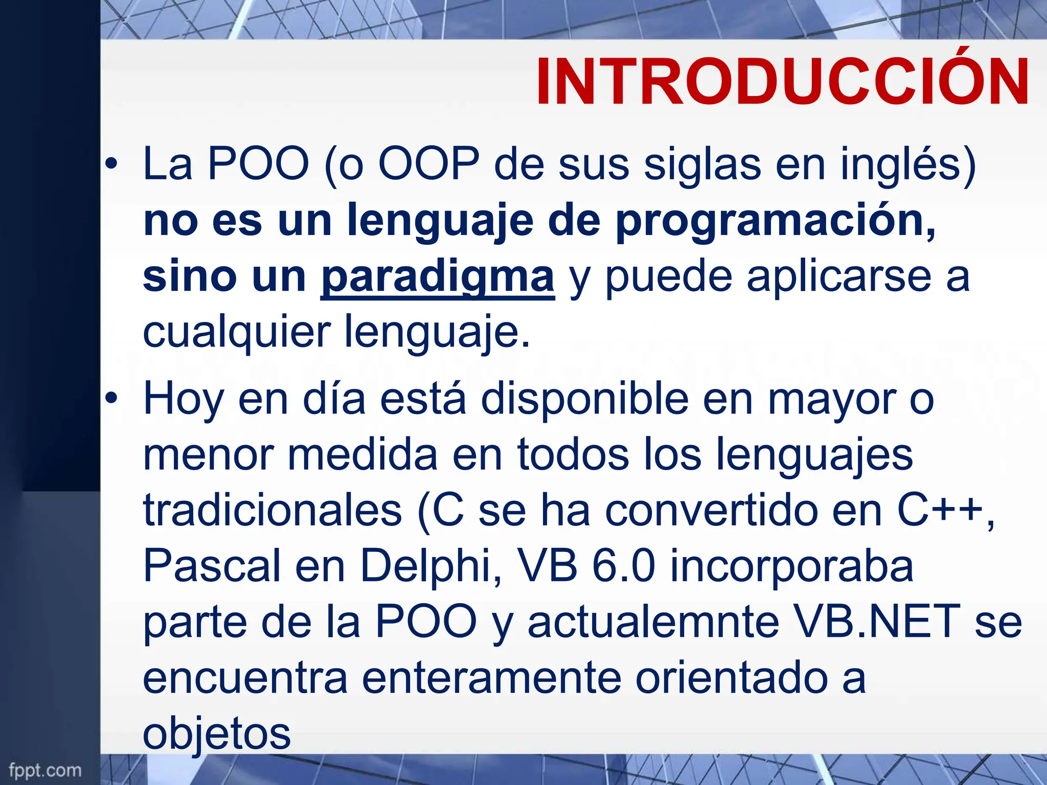 Este documento introduce los conceptos fundamentales de la programación orientada a objetos (POO). Explica que la POO no es un lenguaje sino un paradigma que puede aplicarse a cualquier lenguaje. Describe los conceptos clave de la POO como clases, objetos, encapsulamiento, herencia y polimorfismo. Finalmente, distingue la POO de otros paradigmas como el imperativo y el declarativo.