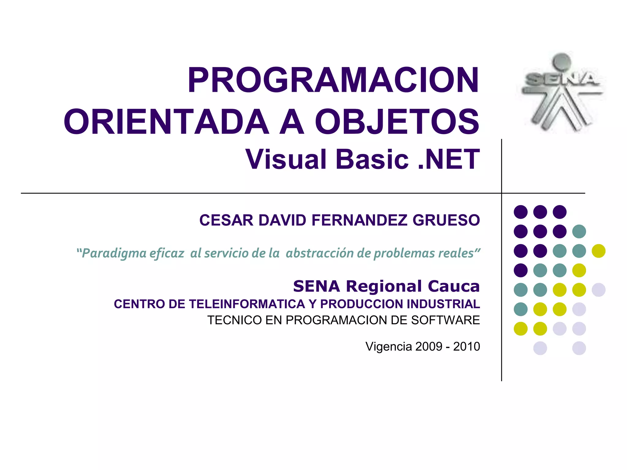 Este documento proporciona una introducción a la programación orientada a objetos. Explica que la POO es un paradigma que permite modelar problemas del mundo real mediante la abstracción de objetos, sus atributos y métodos. Define conceptos clave como clase, objeto, encapsulamiento, herencia y polimorfismo. Finalmente, muestra ejemplos de cómo aplicar estos conceptos en Visual Basic .NET.