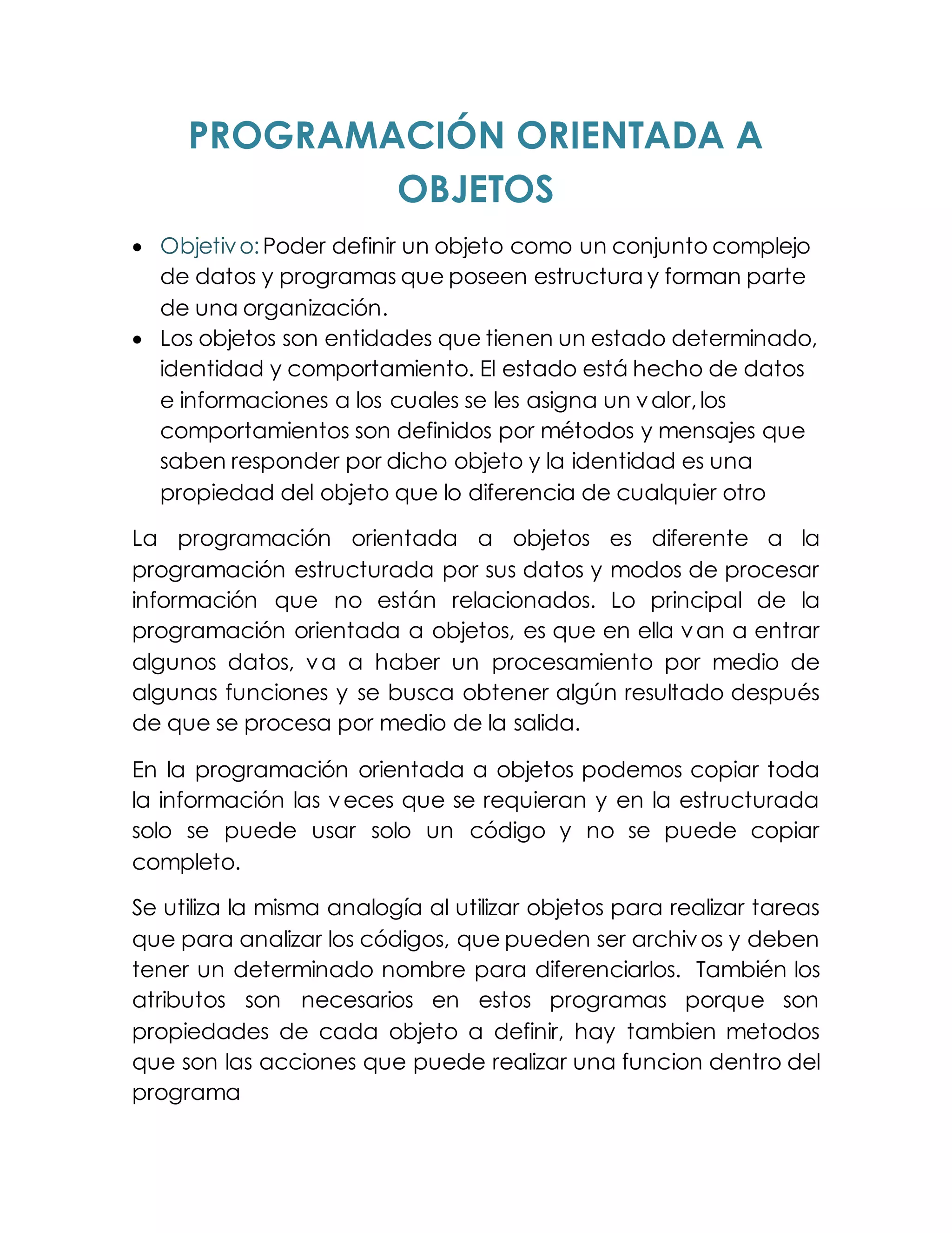 El documento describe los conceptos fundamentales de la programación orientada a objetos, incluyendo que los objetos son entidades que tienen estado, identidad y comportamiento definido por métodos y mensajes. Explica que la programación orientada a objetos es diferente a la programación estructurada porque sus datos y procesamiento de información no están relacionados. También menciona que en la programación orientada a objetos se pueden copiar datos las veces necesarias, a diferencia de la programación estructurada donde solo se puede usar un código una vez.