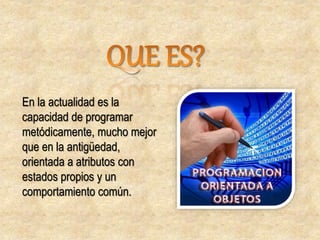 El documento habla sobre la programación orientada a objetos, la cual divide un programa en pequeñas unidades lógicas o objetos que contienen datos y funciones. Describe conceptos como clases, herencia simple y múltiple, y algunos lenguajes de programación orientados a objetos. Finalmente, resalta las ventajas de este paradigma como la reutilización de código, relacionar el sistema al mundo real y agilizar el desarrollo de software.