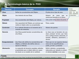 El documento describe los conceptos básicos de programación orientada a objetos en JavaScript. Explica que JavaScript implementa la POO basada en prototipos en lugar de clases. También incluye ejemplos de cómo crear objetos literales y mediante constructores, añadir métodos y propiedades a instancias y prototipos, y usar propiedades y métodos estáticos. Finalmente, proporciona enlaces a diapositivas y ejercicios sobre estos temas de POO en JavaScript.