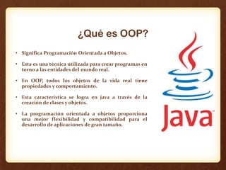 El documento describe conceptos clave de la programación orientada a objetos como clases, objetos, atributos, métodos, herencia, encapsulamiento y polimorfismo. También explica el lenguaje unificado de modelado (UML), que permite visualizar y modelar sistemas mediante diagramas con elementos de modelado estandarizados.