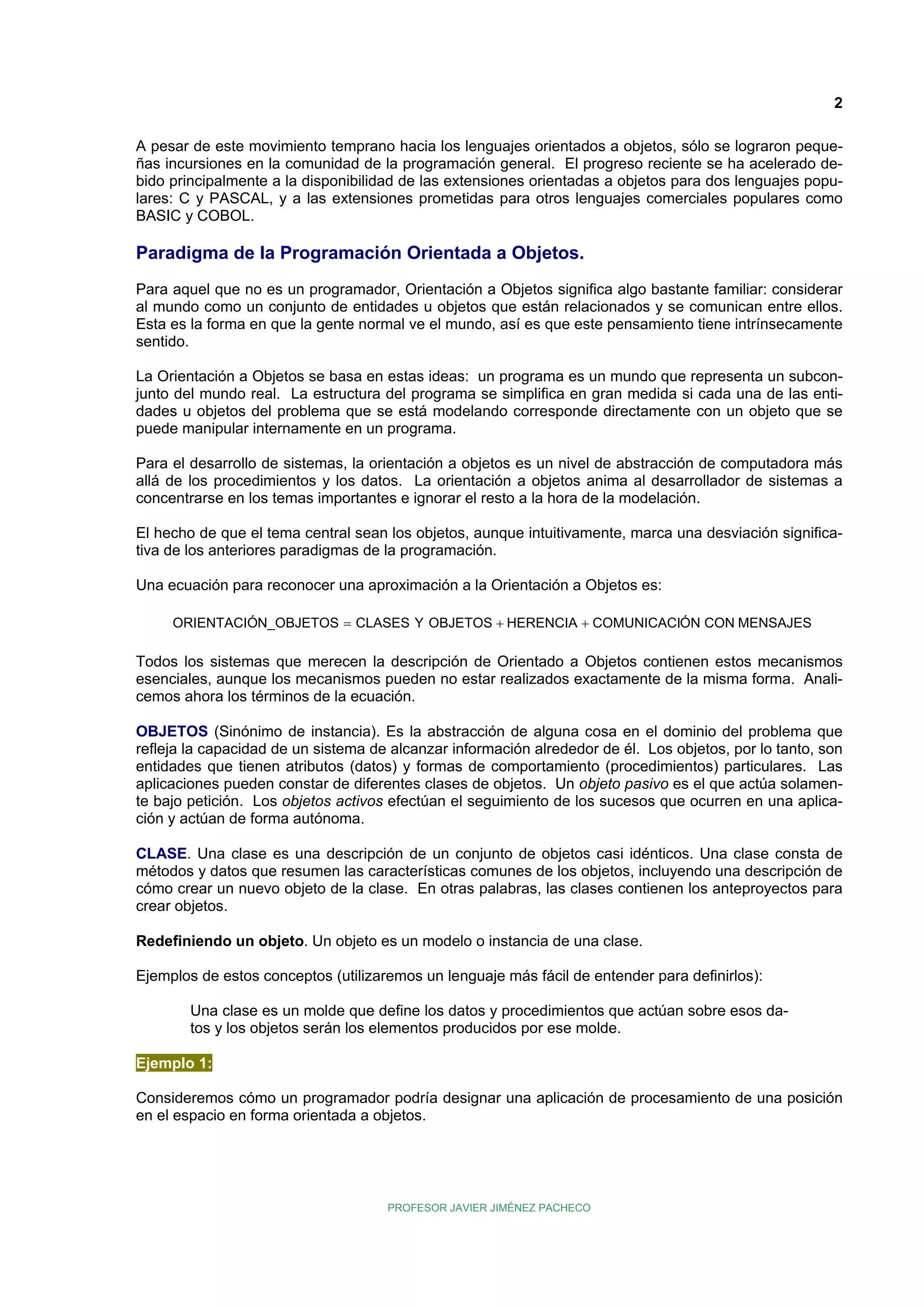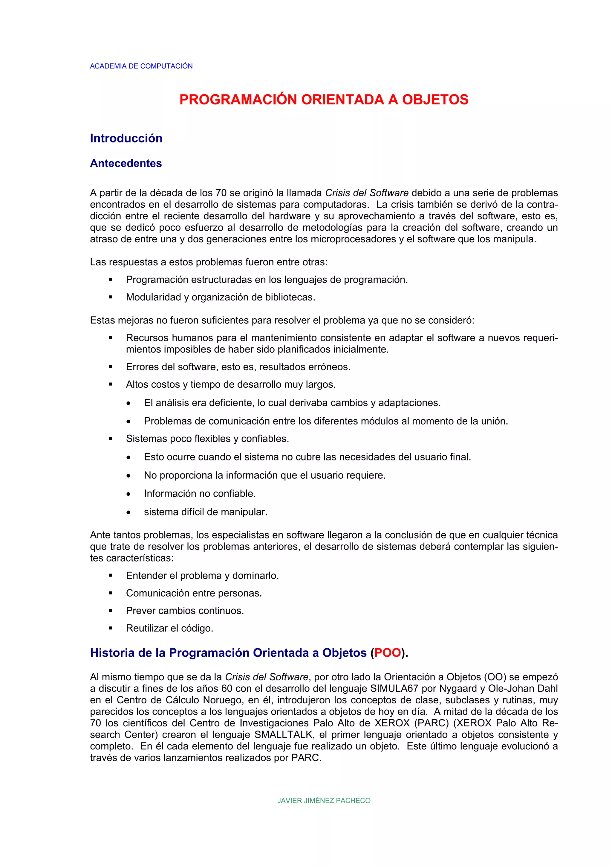 El documento describe los orígenes y principios de la programación orientada a objetos. Explica que surgió en la década de 1970 para resolver problemas como altos costos y tiempos de desarrollo de software. Señala que lenguajes pioneros como SIMULA67 y Smalltalk introdujeron conceptos clave como clases, objetos e herencia. Finalmente, define los principales conceptos de la POO como clases, objetos, herencia y comunicación mediante mensajes.