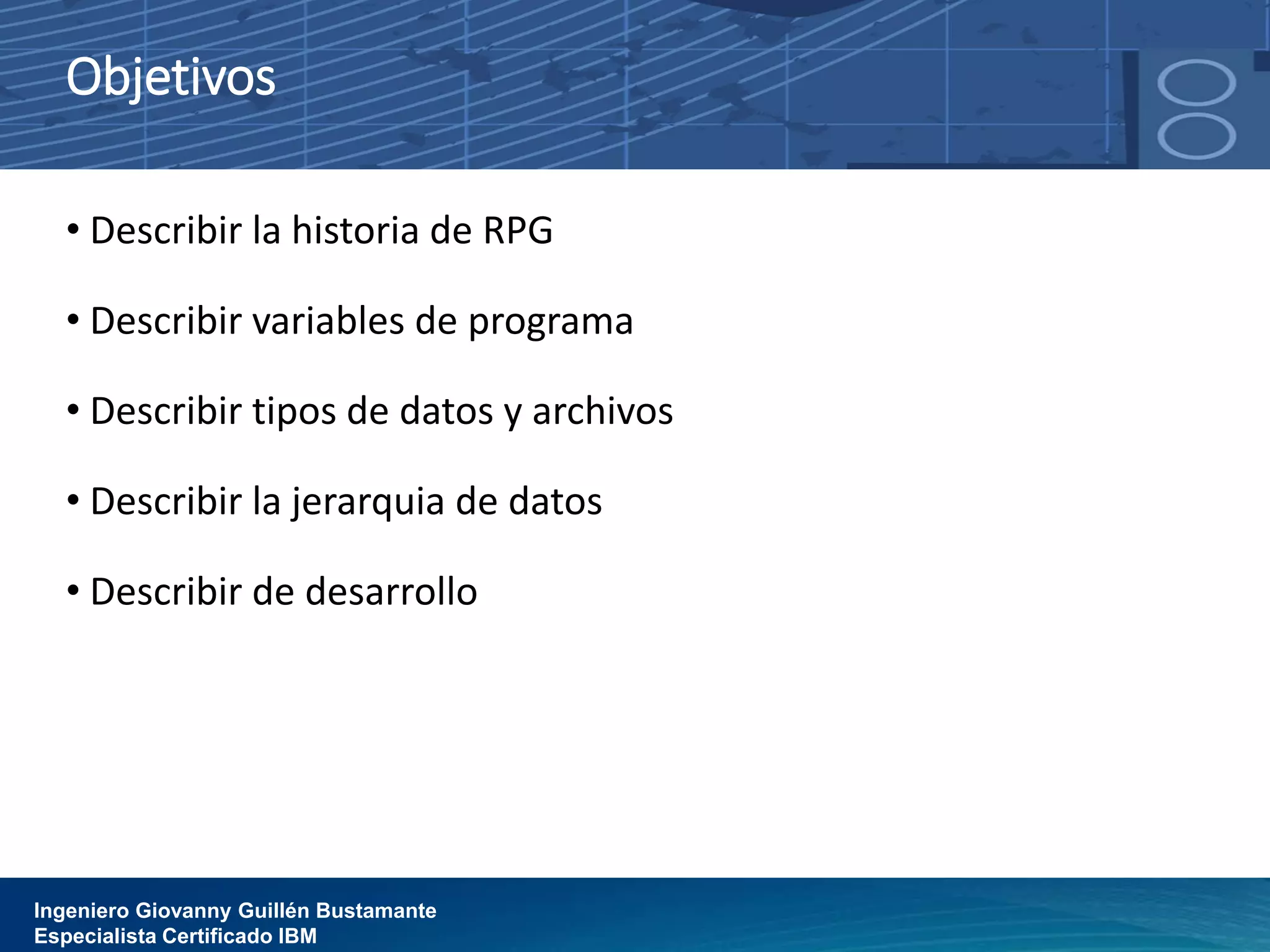 El documento introduce el lenguaje de programación RPG, describiendo su historia desde los años 1960 como un generador de informes hasta convertirse en un lenguaje de programación estructurada en 1994. Explica conceptos básicos como variables de programa, tipos de datos y archivos, y la jerarquía de datos de archivo-registro-campo. También resume el ciclo de desarrollo de programas RPG que incluye definir el problema, diseñar la solución, escribir y probar el programa, y documentarlo.