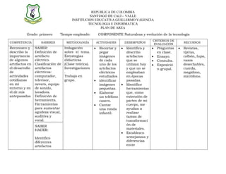 El documento presenta el plan de área para el grado primero del componente "Naturaleza y evolución de la tecnología" en la Institución Educativa Guillermo Valencia. Incluye los criterios de competencia, saberes, metodología, actividades, desempeños y recursos a utilizar. El objetivo es que los estudiantes reconozcan y describan la importancia de los artefactos eléctricos en el desarrollo de actividades cotidianas.
