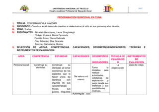 Este documento presenta una programación quincenal para niños de 2 años en una cuna, con el propósito de celebrar la Navidad. La programación incluye actividades semanales en áreas como el descubrimiento del mundo, la comunicación, la psicomotricidad y el desarrollo personal y social, con indicadores y desempeños específicos. Cada actividad está planificada con estrategias, recursos e interacciones entre adultos, niños y objetos para trabajar diferentes competencias.