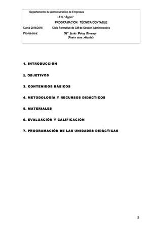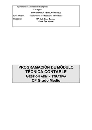 Este documento presenta la programación del módulo de Técnica Contable del curso 2015/2016 para el Ciclo Formativo de Grado Medio de Gestión Administrativa. Incluye la introducción, objetivos, contenidos básicos, metodología y recursos didácticos, y programación de las unidades didácticas. El objetivo principal es que los estudiantes adquieran las habilidades técnicas y de gestión contable necesarias para desempeñarse en el área administrativa.