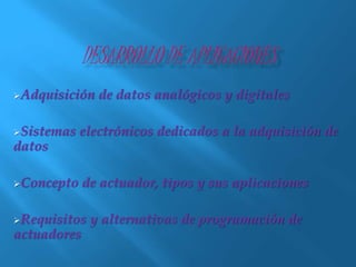 El documento habla sobre sistemas de adquisición de datos. Explica que estos sistemas capturan señales del mundo real mediante sensores, las convierten a señales eléctricas y luego a datos digitales que pueden procesarse. Describe los componentes clave de un sistema de adquisición como hardware, software, computadora y sensores. También explica diferentes tipos de actuadores como hidráulicos, neumáticos y eléctricos y cómo se usan para controlar sistemas mecatrónicos.