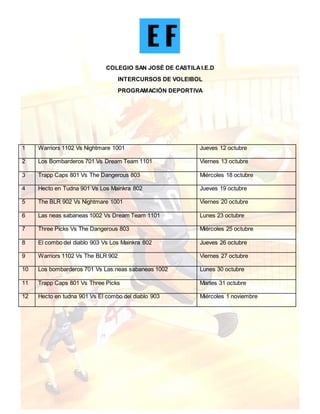 La programación deportiva del colegio San José de Castilla para los intercursos de voleibol incluye 12 partidos programados entre el 12 de octubre y el 1 de noviembre, enfrentando a equipos como Warriors, Nightmare, Los Bombarderos, Dream Team, Trapp Caps, Hecto en Tudna, The BLR, Las Neas Sabaneas, The Dangerous y El Combo del Diablo.
