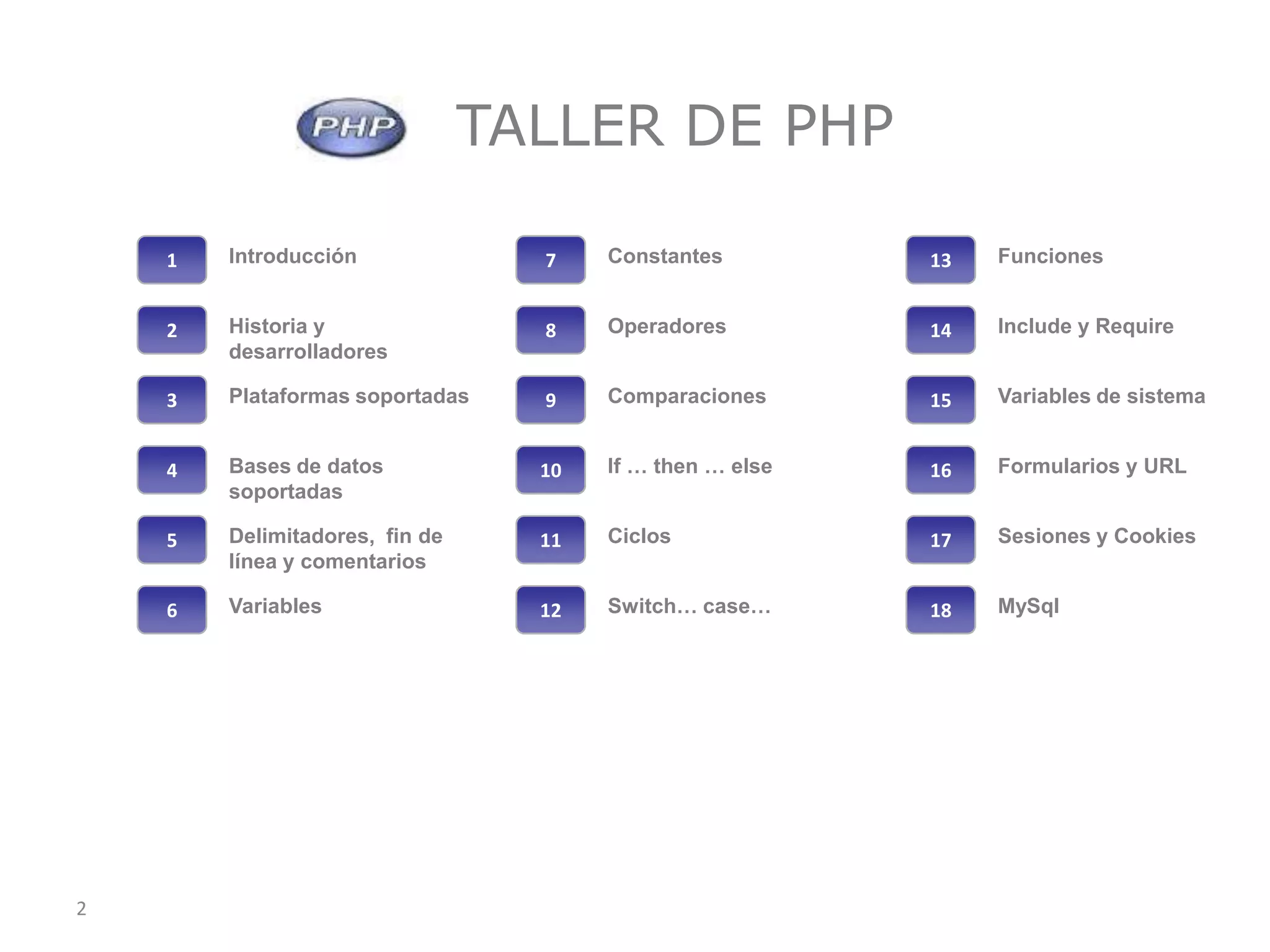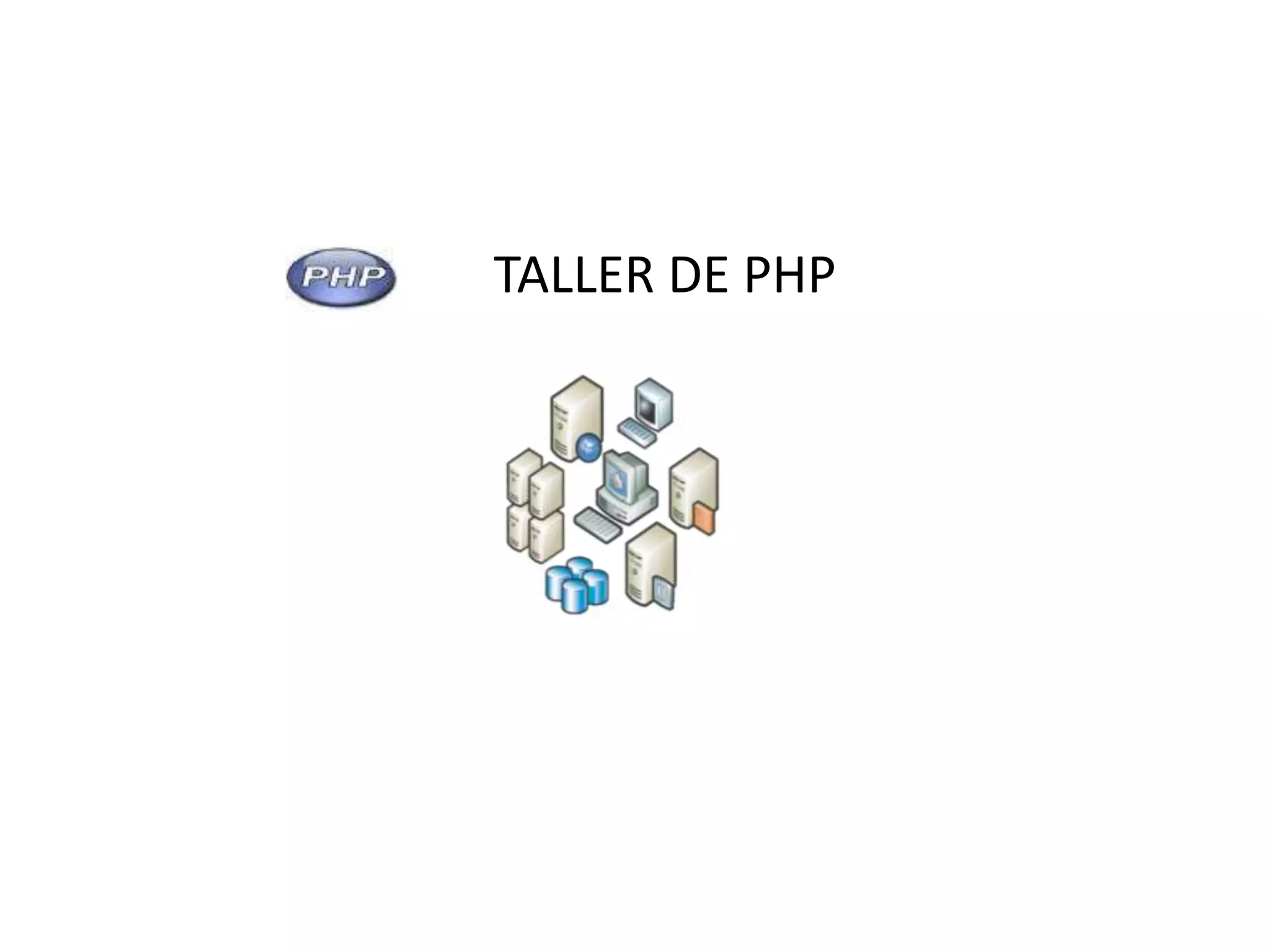 Este documento presenta un taller sobre PHP. Resume los temas principales de PHP como su historia, plataformas soportadas, variables, constantes, funciones, comparaciones, ciclos, formularios y MySQL.