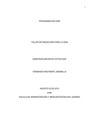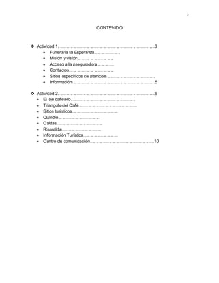 Este documento presenta información sobre dos actividades. La primera describe una funeraria ficticia llamada Funeraria la Esperanza, incluyendo su misión, visión, servicios y contactos. La segunda actividad proporciona detalles sobre el Eje Cafetero de Colombia, incluyendo sitios turísticos populares en los departamentos de Quindío, Caldas y Risaralda. El documento concluye con información sobre cómo comunicarse con los sitios presentados.