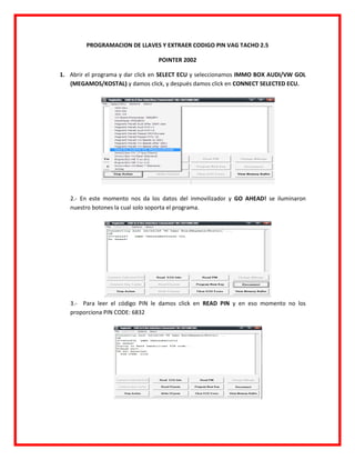 El documento proporciona instrucciones para programar llaves y extraer el código PIN de un inmovilizador VAG Tacho 2.5 usando el programa Pointer 2002. Se explica cómo conectar el programa al inmovilizador, leer el código PIN existente, y programar una nueva llave ingresando el código PIN y la cantidad de llaves a programar. Adicionalmente, se promueven cursos de capacitación y se proporcionan datos de contacto para obtener servicios relacionados a la seguridad automotriz.