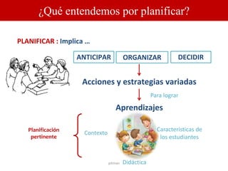 Este documento presenta una estrategia integral para mejorar los aprendizajes en instituciones educativas polidocentes urbanas. Explica que la planificación implica anticipar, organizar y decidir acciones y estrategias variadas considerando el contexto, los aprendizajes, las características de los estudiantes y la didáctica para lograr aprendizajes pertinentes. Luego, describe los procesos pedagógicos, elementos de la programación anual, programación de unidades didácticas y sesiones de aprendizaje. El objetivo es establecer