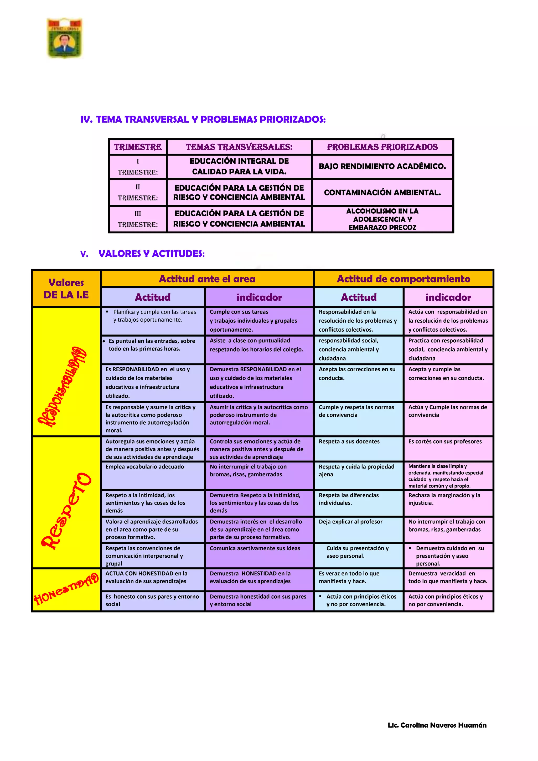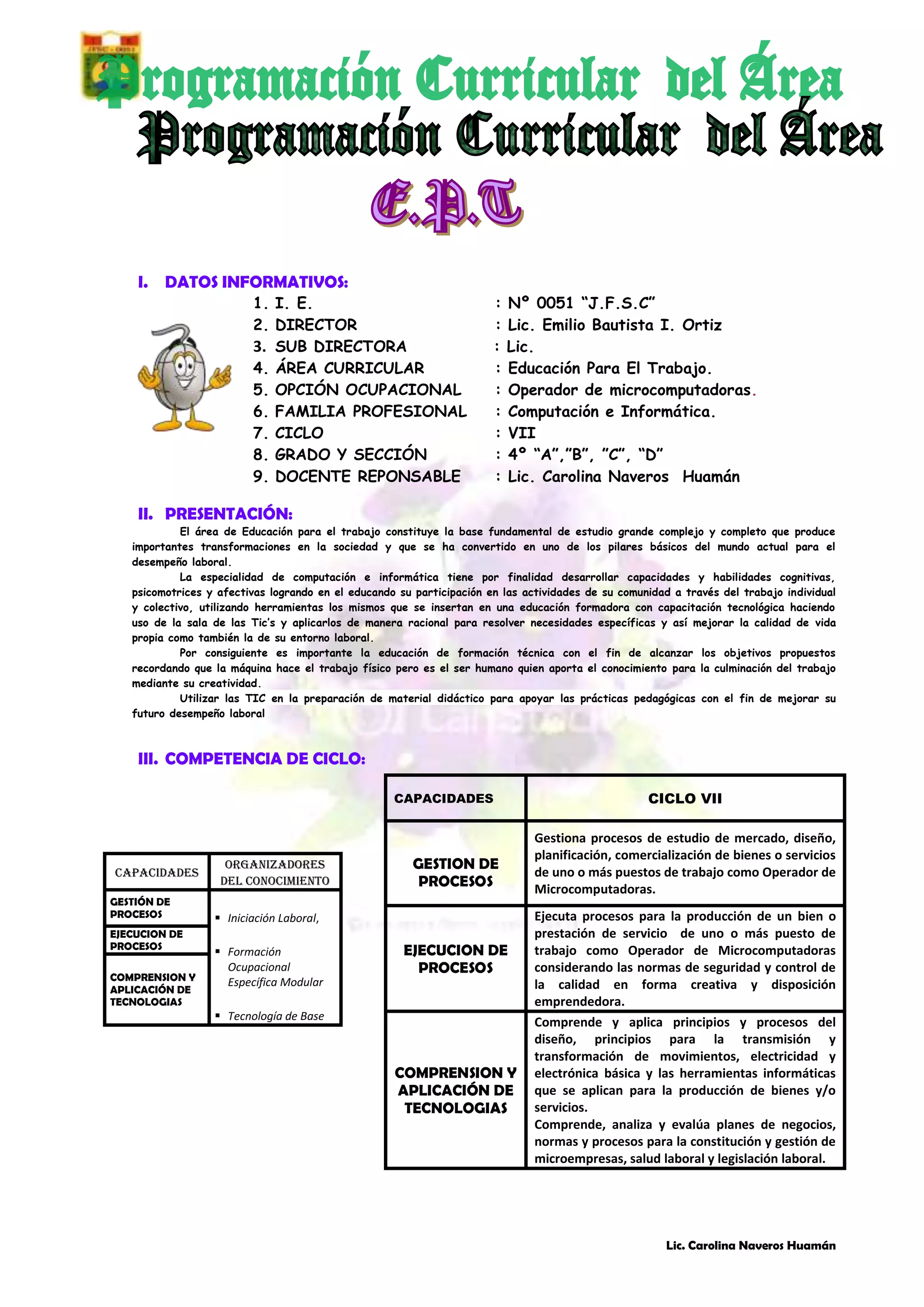 Este documento presenta la información de un colegio técnico profesional. Incluye los datos del colegio, directivos y docentes. Describe el área curricular de Educación para el Trabajo y la opción ocupacional de Operador de Microcomputadoras. Además, detalla la organización de las unidades que comprenden contenidos, temas transversales, problemas priorizados y métodos de enseñanza.