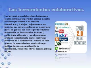 Las herramientas colaborativas permiten a los usuarios comunicarse y trabajar conjuntamente compartiendo información en diferentes formatos sin importar su ubicación física. Requieren programas cliente en los computadores de los usuarios y programas servidor alojados en servidores web para ofrecer los servicios. Ejemplos populares son Google Docs, Zoho, Huddle y Basecamp.