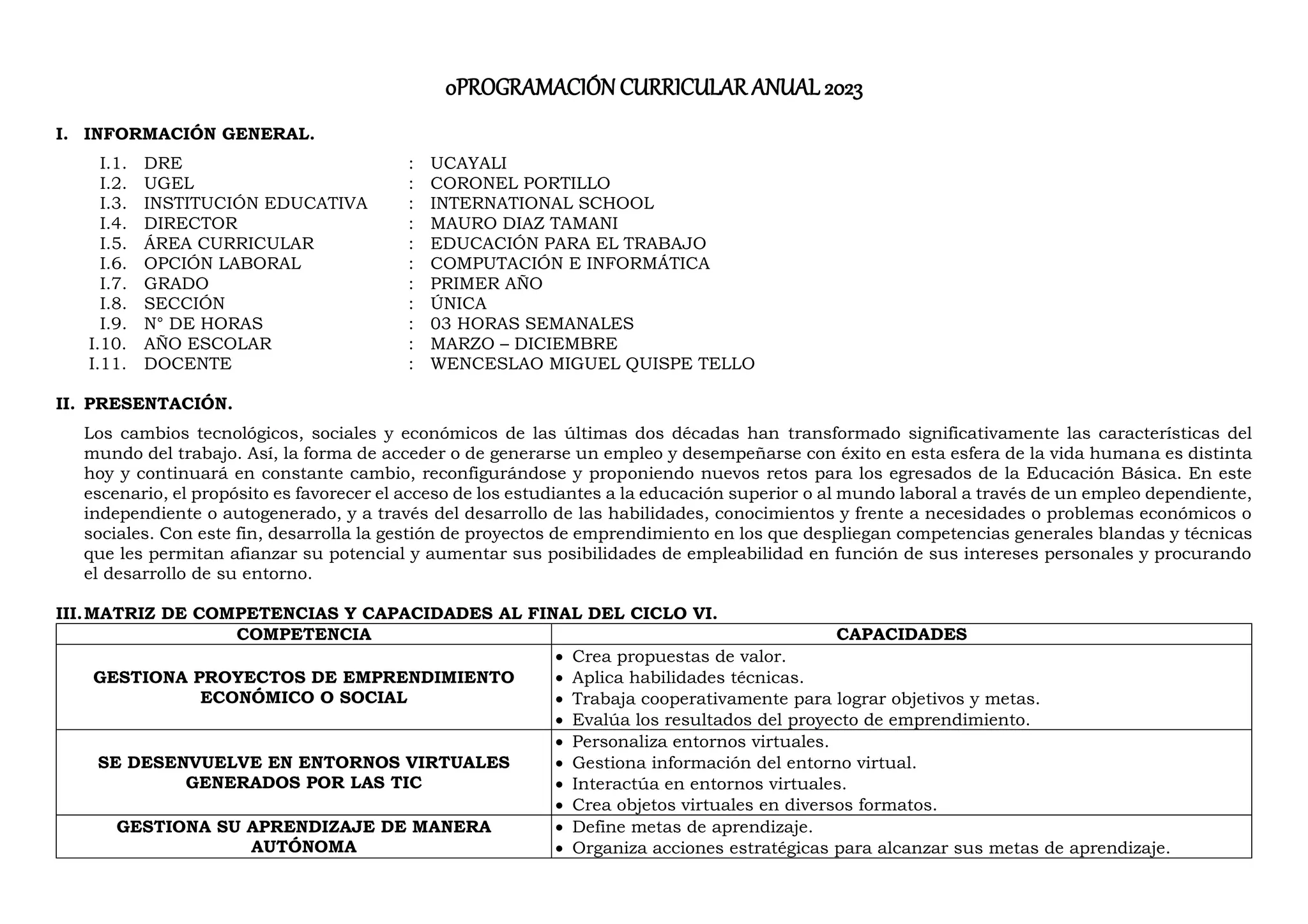 Este documento presenta la programación curricular anual 2023 para el grado primer año de la opción laboral de computación e informática en la Institución Educativa International School. Incluye información general sobre la institución, los estándares y desempeños que los estudiantes deben alcanzar, y cinco aprendizajes fundamentales en temas como identidad, ciudadanía, respeto a la diversidad, motricidad y alimentación saludable.