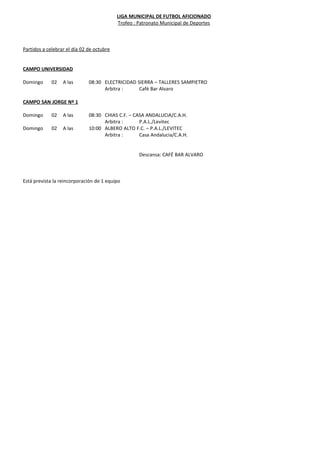 El documento contiene información sobre varios partidos de fútbol amateur que se celebrarán los días 1 y 2 de octubre en diferentes campos de la ciudad. Se proporcionan detalles sobre los equipos participantes, los horarios y los árbitros asignados a cada partido.
