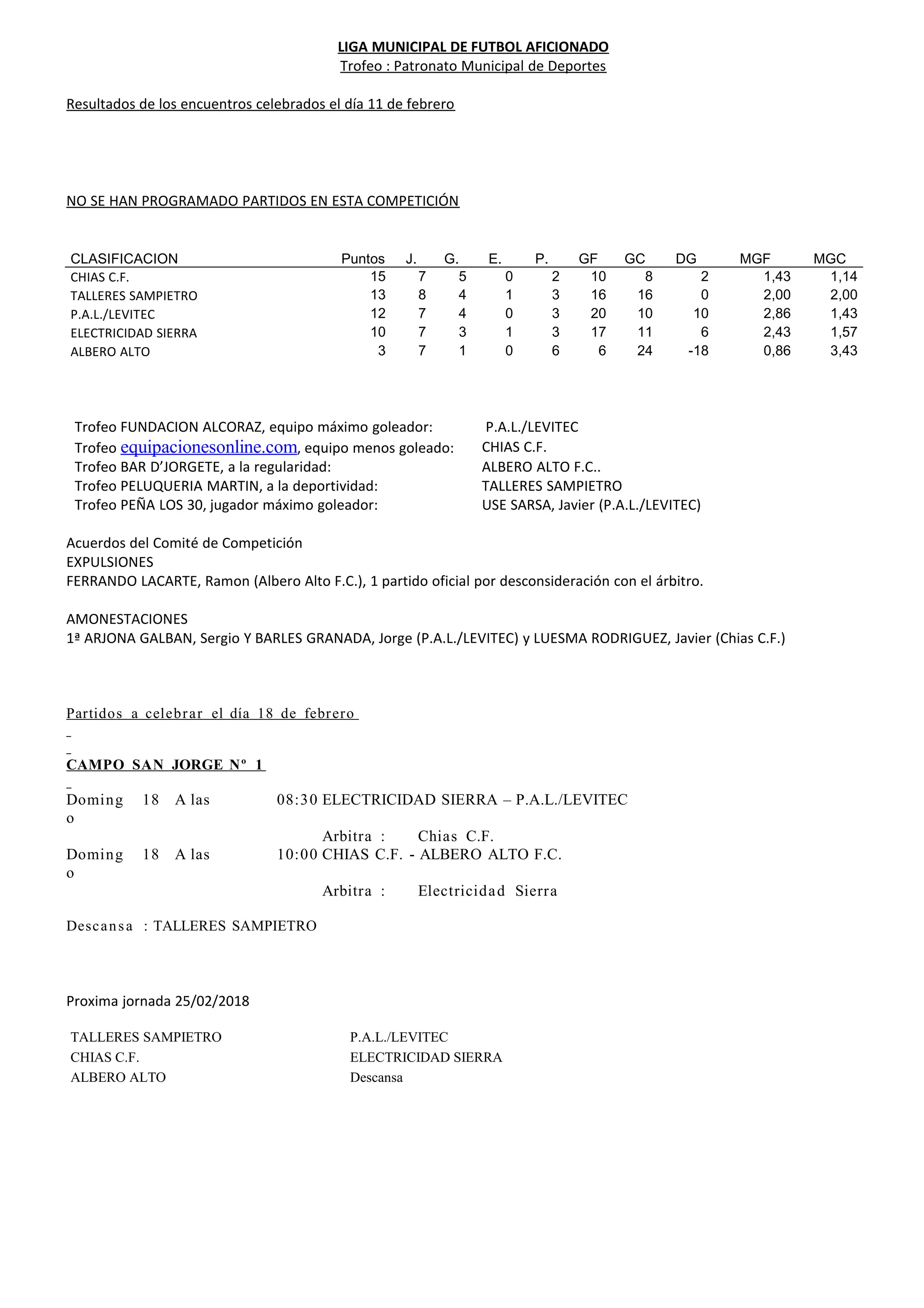 Este documento resume los resultados de varios partidos de fútbol amateur celebrados recientemente en diferentes ligas y categorías. Incluye clasificaciones, trofeos, árbitros asignados y sanciones. En 3 oraciones o menos: Resume los resultados de varios partidos de fútbol amateur, con clasificaciones y detalles sobre árbitros, trofeos y sanciones aplicadas a jugadores. Además, programa los próximos partidos a celebrar en diferentes campos los días 17 y 18 de febrero.