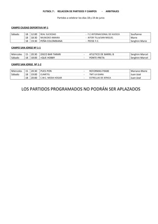 El documento resume los resultados de varios partidos de fútbol amateur y aficionado celebrados recientemente. Informa sobre las clasificaciones y los equipos que avanzan a la siguiente ronda de la Copa Primavera de Fútbol 7. También incluye detalles sobre próximos partidos y reuniones.