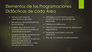Este documento presenta los elementos que deben incluirse en las programaciones didácticas de cada área para el curso 2014/2015 en el CEIP NTRA. SRA. DEL VALLE. Incluye una introducción sobre las características del área, la secuencia y temporalización de los contenidos, los criterios de evaluación y estándares de aprendizaje, la integración de las competencias clave, estrategias de evaluación, criterios de calificación, orientaciones metodológicas, materiales y un plan de actividades complementarias. También menciona la neces