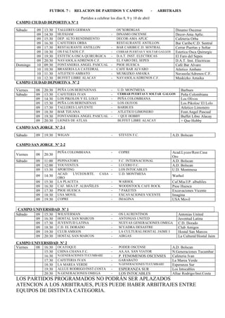 Este documento resume los resultados de los partidos de fútbol amateur celebrados el 3 de abril. El Navasola ganó 5-2 sobre Rafaela Estación/Cafetería Mía, mientras que Residencia Virgen de Fátima perdió 2-6 ante P.A.L./Braco S.L. y Café Bar Álvaro ganó 7-2 sobre Caf.Rest.Hiedra/San Miguel. El documento también incluye la clasificación actual y los próximos partidos a celebrarse el 10 de abril.