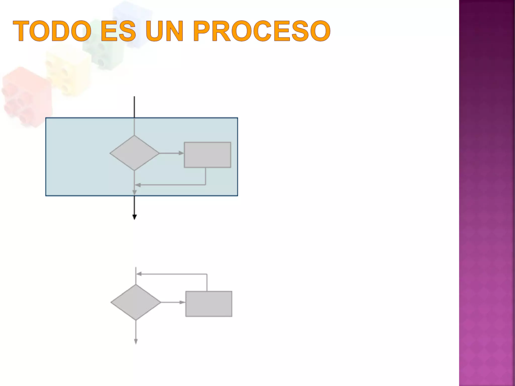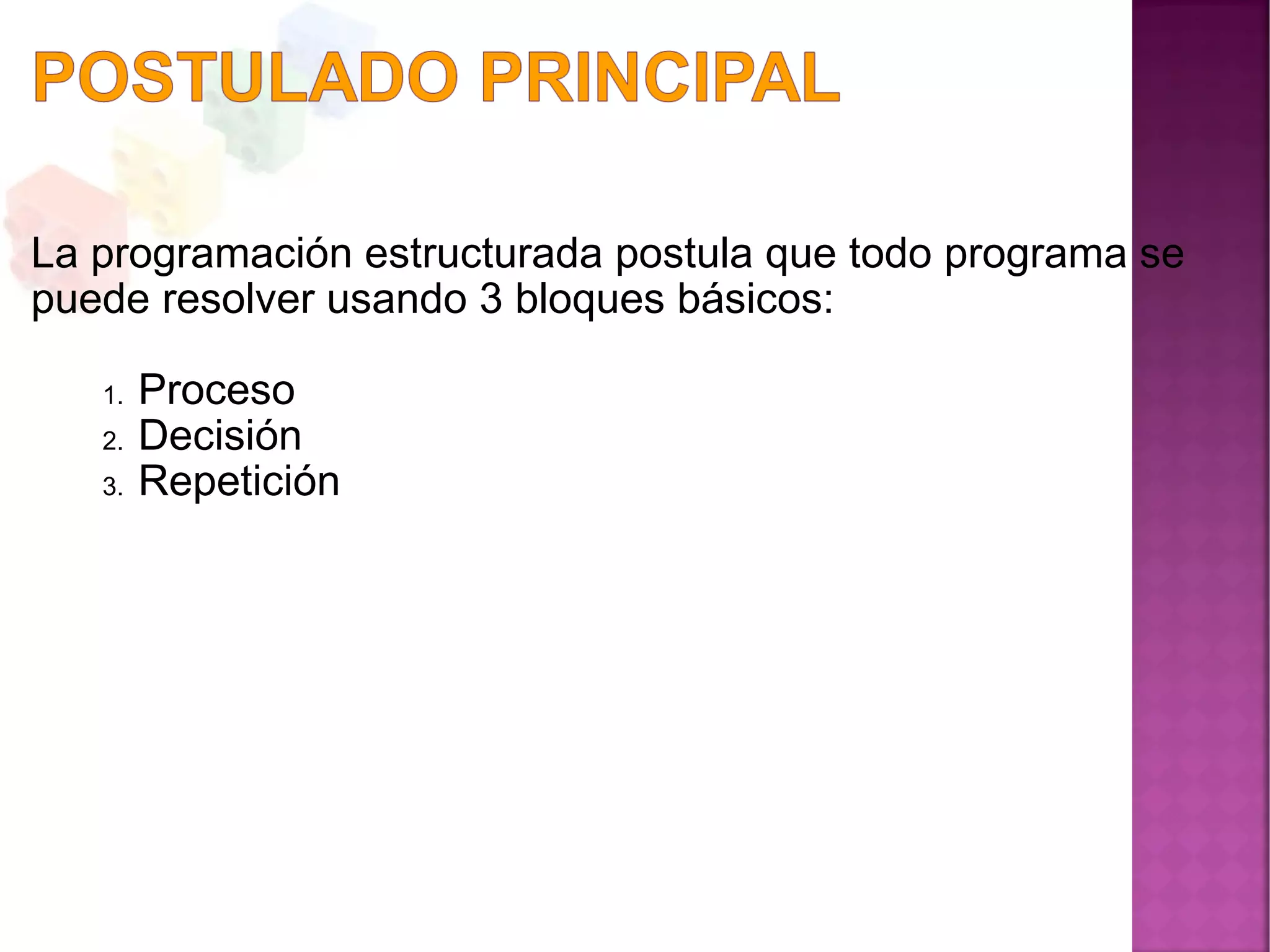 La programación estructurada postula que todo programa se puede resolver usando 3 bloques básicos: proceso, decisión y repetición. Cada bloque tiene una entrada y salida, y una secuencia de bloques también se considera un proceso. De este modo, cualquier programa puede expresarse como un solo proceso compuesto de estos tres bloques básicos.