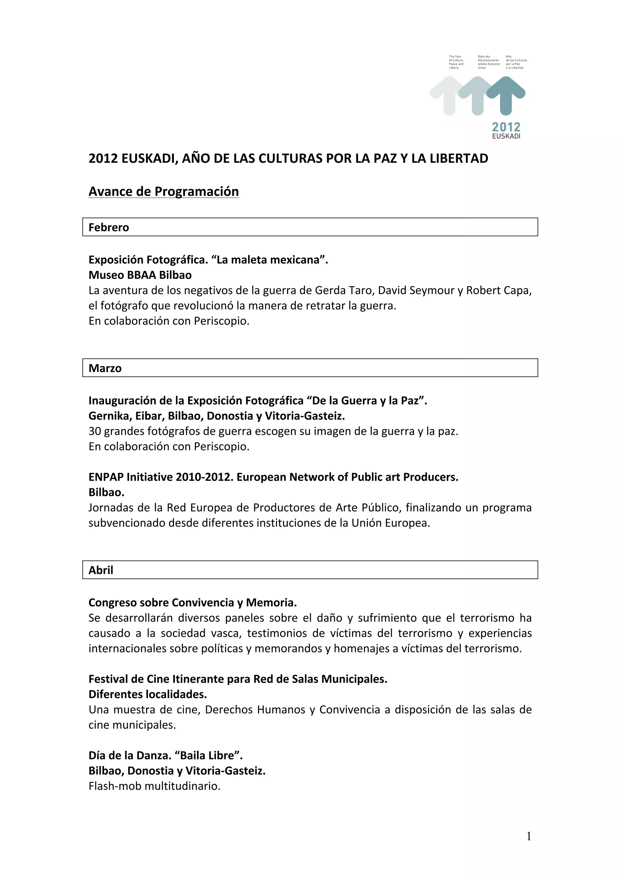 Este documento presenta la programación cultural para el año 2012 en el País Vasco, declarado Año de las Culturas por la Paz y la Libertad. La programación incluye exposiciones fotográficas, congresos, festivales de cine, poesía y música, conciertos y espectáculos teatrales con el objetivo de promover los derechos humanos, la paz y la convivencia. Los eventos tendrán lugar en diferentes ciudades vascas como Bilbao, Donostia, Vitoria-Gasteiz y Gern