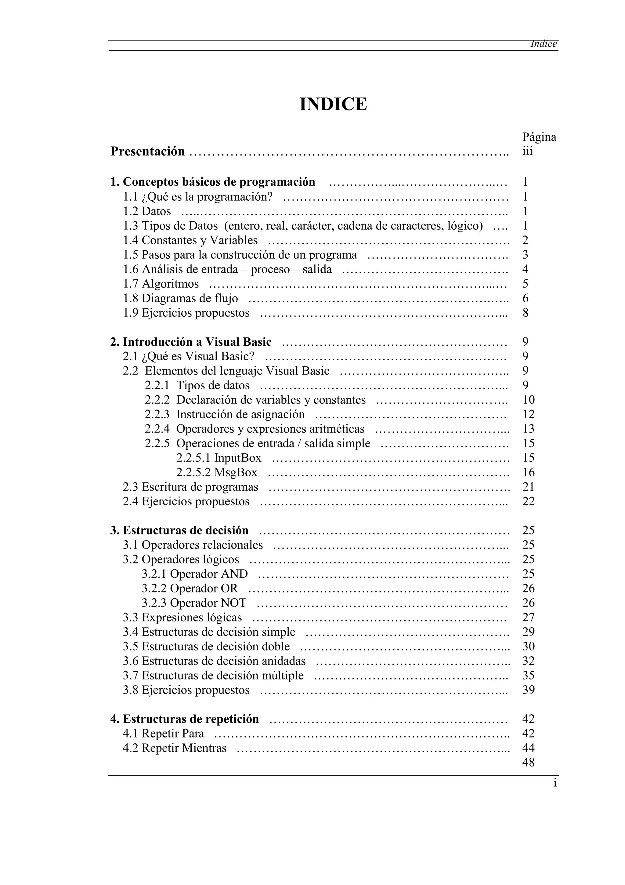 Este documento presenta los conceptos básicos de programación, incluyendo los tipos de datos, constantes y variables, los pasos para construir un programa, el análisis de entrada-proceso-salida, algoritmos y diagramas de flujo. Luego introduce Visual Basic como lenguaje de programación, explicando sus tipos de datos, declaración de variables, operadores aritméticos, estructuras de entrada/salida y escritura de programas. Finalmente describe estructuras de decisión, repetición, formularios y controles.