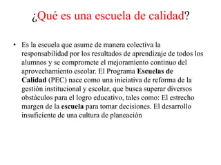 El documento describe el Programa de Escuelas de Calidad (PEC), una iniciativa para mejorar la gestión y resultados educativos mediante el fortalecimiento de la autonomía escolar y el desarrollo de una cultura de planeación y mejora continua. El PEC concibe a la escuela como la unidad clave para identificar problemas, metas y estrategias orientadas a mejorar la calidad educativa. Además, señala que una escuela eficaz es aquella que logra el desarrollo integral de todos sus alumnos, más allá de factores socioe