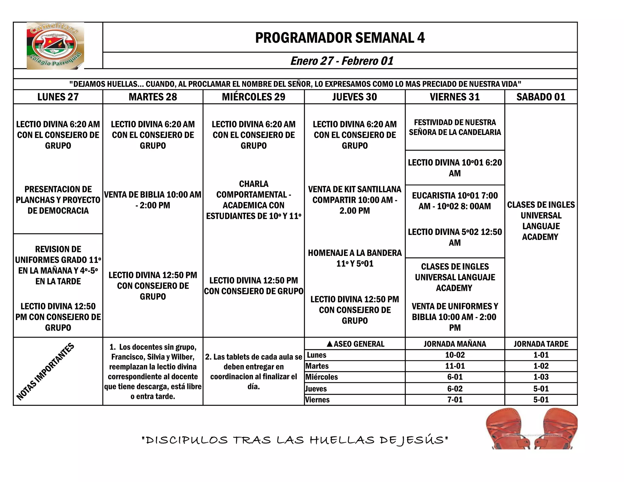 Este documento presenta el programa semanal del 27 de enero al 1 de febrero. Incluye actividades diarias como lectio divina, venta de biblias y uniformes, y clases de inglés. El viernes 31 se celebrará la festividad de Nuestra Señora de la Candelaria con misas y actividades por grados en las mañanas y tardes.