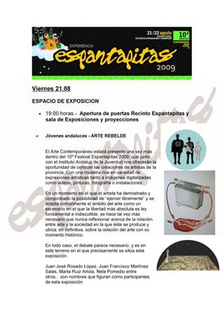 Este documento presenta la programación del festival Espantapitas, incluyendo exposiciones, proyecciones de documentales y cortometrajes, talleres y conciertos musicales durante dos días. Se destacan exposiciones sobre migración y arte rebelde, además de proyecciones de películas documentales y cortometrajes locales. Los talleres cubren temas como radio, reciclaje, yoga y fútbol con chapas. La programación musical incluye conciertos en dos escenarios con diversos artistas y DJs.