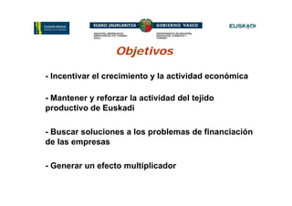 Este documento describe un programa de apoyo financiero a las empresas en el País Vasco en 2012 con el objetivo de estimular el crecimiento económico. El programa proporciona 1,000 millones de euros en avales a través de seis herramientas que permitirán activar 2,276 millones de euros en préstamos. Las herramientas incluyen avales a través de sociedades de garantía, préstamos participativos, y capital riesgo para proyectos empresariales estratégicos.