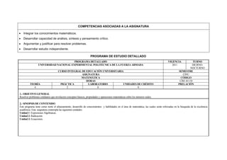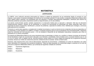 El documento presenta un programa de estudio para la asignatura de Matemáticas Básica en la UNEFA. El programa busca capacitar a los estudiantes en habilidades matemáticas necesarias para su educación universitaria a través de unidades sobre expresiones algebraicas, radicación y ecuaciones. El programa se basa en enfoques constructivistas y busca desarrollar competencias como el análisis crítico a través de actividades prácticas y evaluaciones continuas.