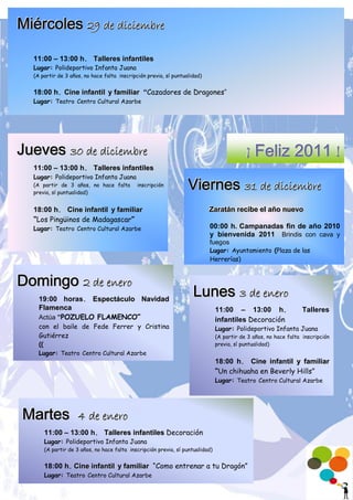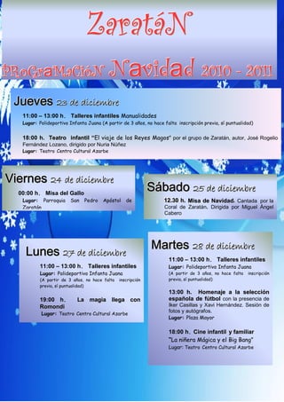 Este documento presenta el programa de actividades navideñas de 2010-2011 en Zaratán, que incluye talleres infantiles, obras de teatro, cine infantil, misas, cabalgata de Reyes Magos, exposiciones de arte y más. Las actividades tendrán lugar del 23 de diciembre al 7 de enero en lugares como el polideportivo Infanta Juana, el teatro Centro Cultural Azarbe y la iglesia de San Pedro Apóstol. El programa ha sido organizado por el ayuntamiento de Zaratán y cuenta con la colaboración de otras instit