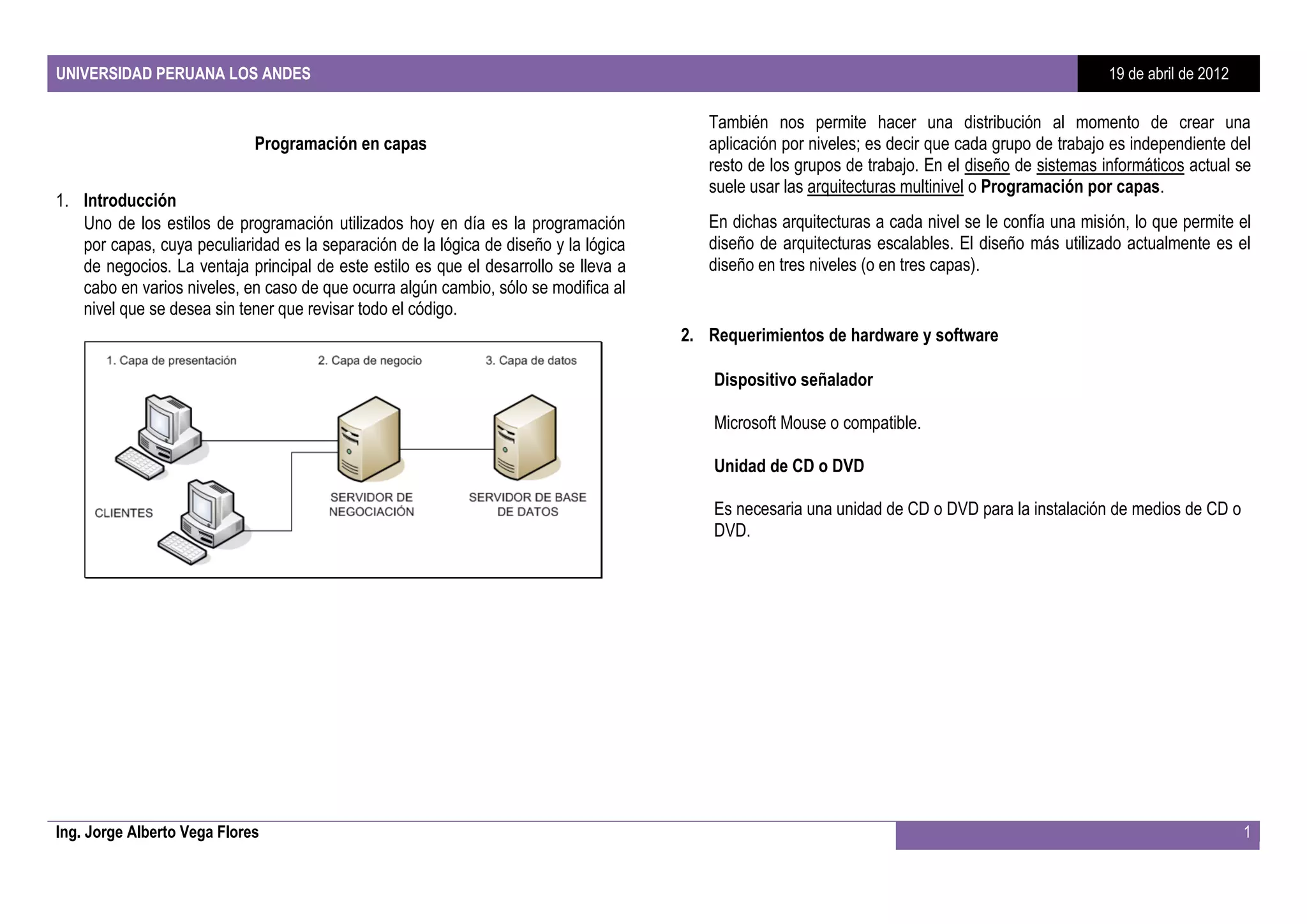 Este documento describe la programación por capas y el uso de Microsoft Visual Studio 2008 para crear una aplicación de Windows Forms. Explica que la programación por capas separa la lógica de negocios de la lógica de diseño, permitiendo modificar un nivel sin afectar a los demás. Luego detalla cómo crear un proyecto en Visual Studio 2008 usando la plantilla de aplicación de Windows Forms, y cómo configurar un formulario principal MDI con menú, barra de estado y botones.