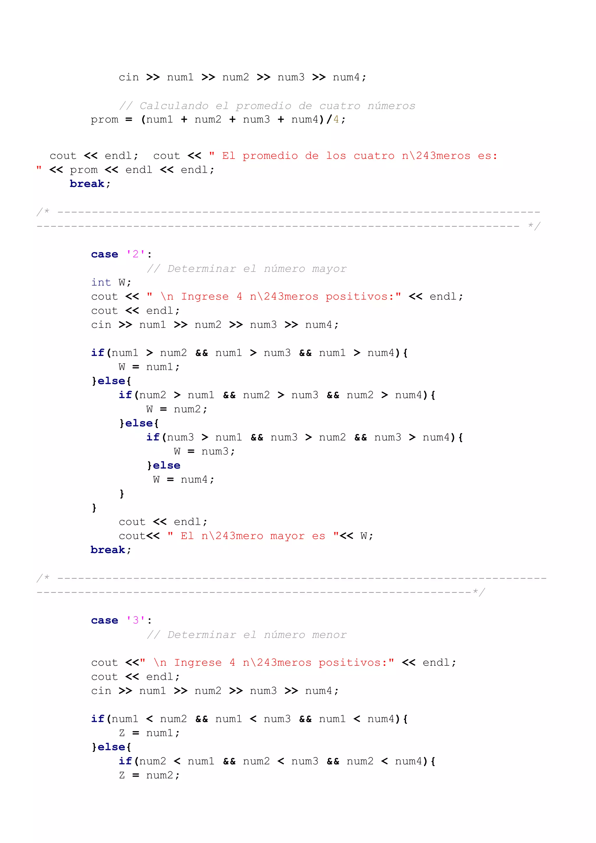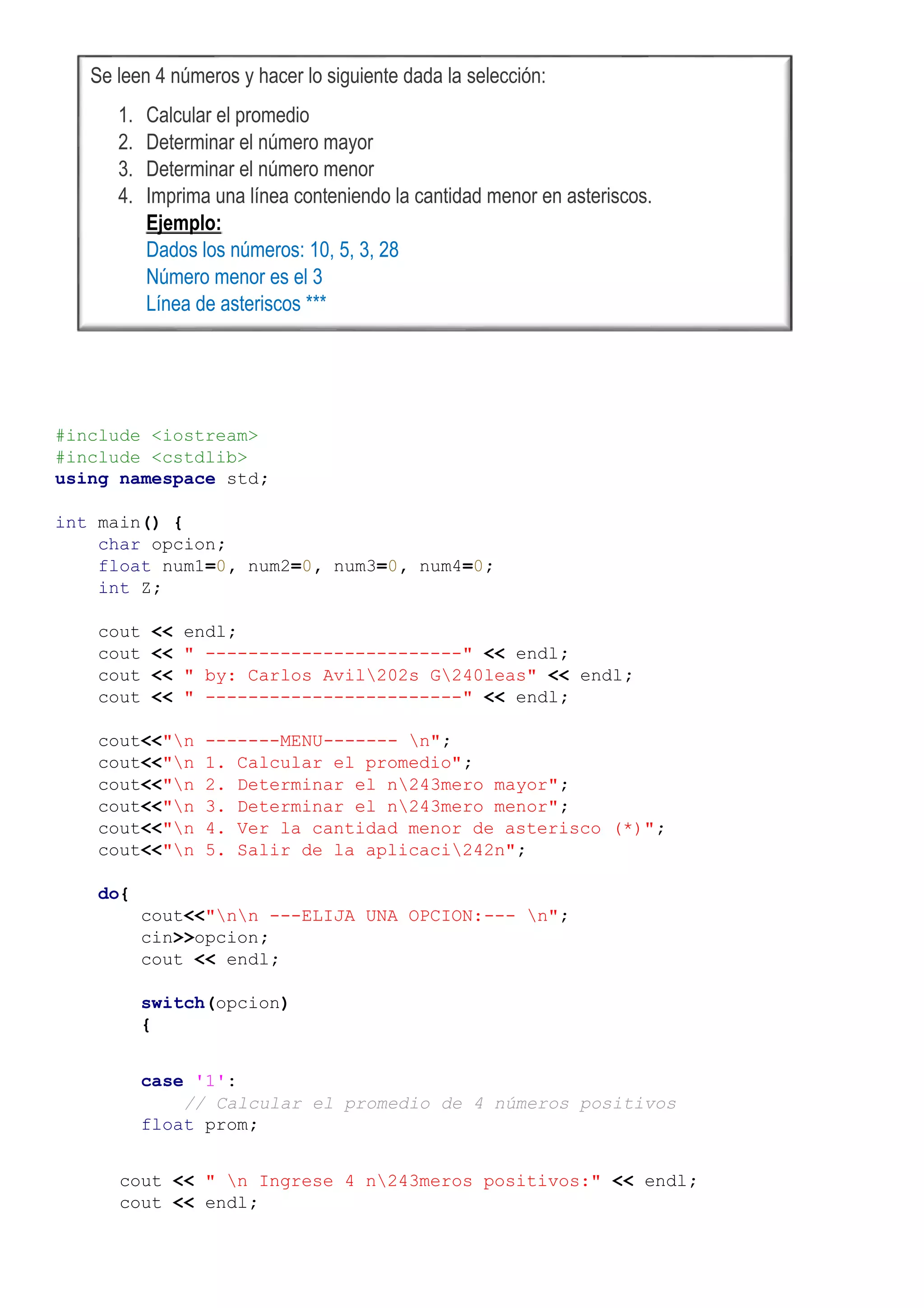 El documento presenta un programa en C++ que permite al usuario realizar diversas operaciones con cuatro números positivos, como calcular el promedio, determinar el número mayor y menor, y mostrar una línea de asteriscos correspondiente al número menor. El menú interactivo ofrece cinco opciones para que el usuario elija y ejecuta la operación seleccionada. Finalmente, el programa termina cuando el usuario decide salir.