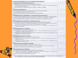 El documento aborda la programación y evaluación por competencias en la educación primaria, enfatizando la necesidad de enseñar y evaluar habilidades aplicativas en lugar de dependencia de la memorización. Se discuten las dimensiones de las competencias, métodos de enseñanza y evaluación, y la responsabilidad compartida entre familia y escuela para la formación integral del alumnado. Se resalta que la educación debe centrarse en el desarrollo de competencias básicas que permitan a los estudiantes responder a los desafíos en diversos ámbitos de la vida.