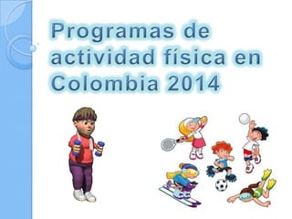El documento describe varios programas y estrategias en Colombia para promover la actividad física y reducir el sedentarismo, incluyendo Colombia Activa y Saludable, Supérate, "Por su salud, muévase pues", y una estrategia en Bogotá para mejorar la calidad de vida a través de 150 minutos de actividad física semanal para adultos y 1 hora diaria para niños y adolescentes.