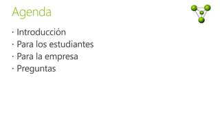 Este documento presenta las credenciales y experiencia de Peter J. Concha Regatto como desarrollador web y líder de comunidades de estudiantes. También describe varios recursos gratuitos de Microsoft para estudiantes, incluyendo Dreamspark que ofrece software legal y gratuito, Microsoft Student Partners para el reconocimiento de estudiantes talentosos, y Microsoft Virtual Academy que provee certificados y material de estudio en línea.