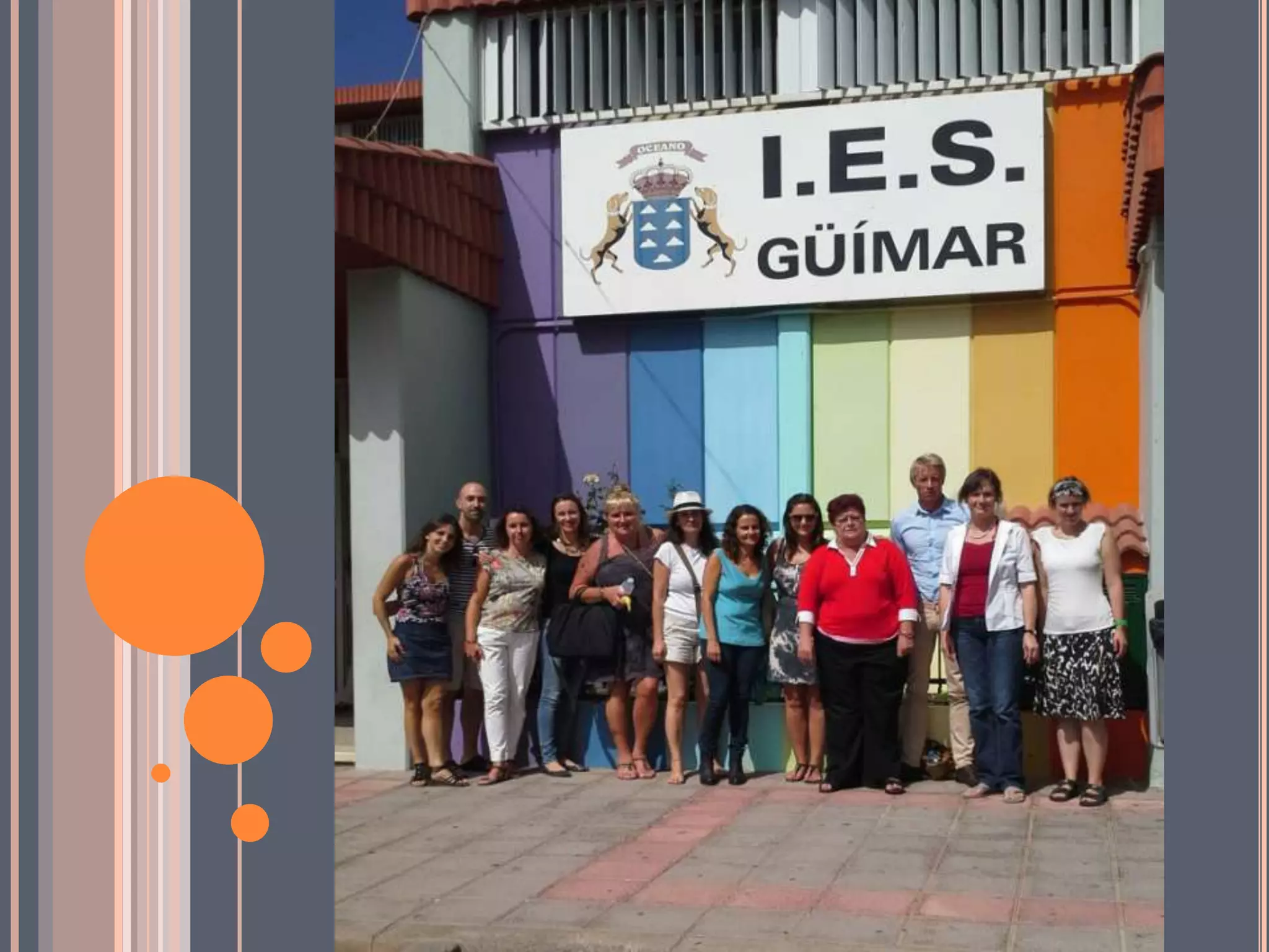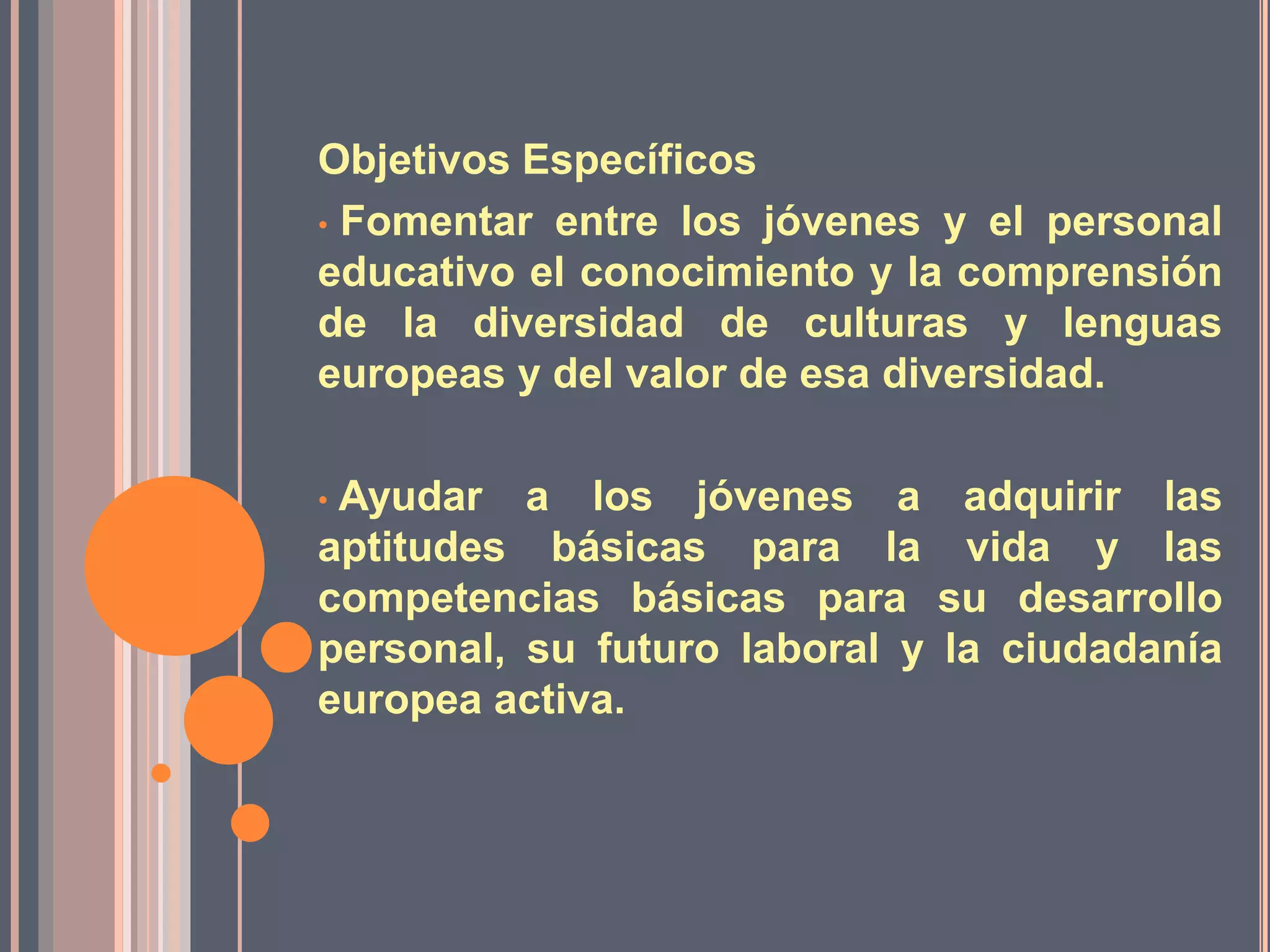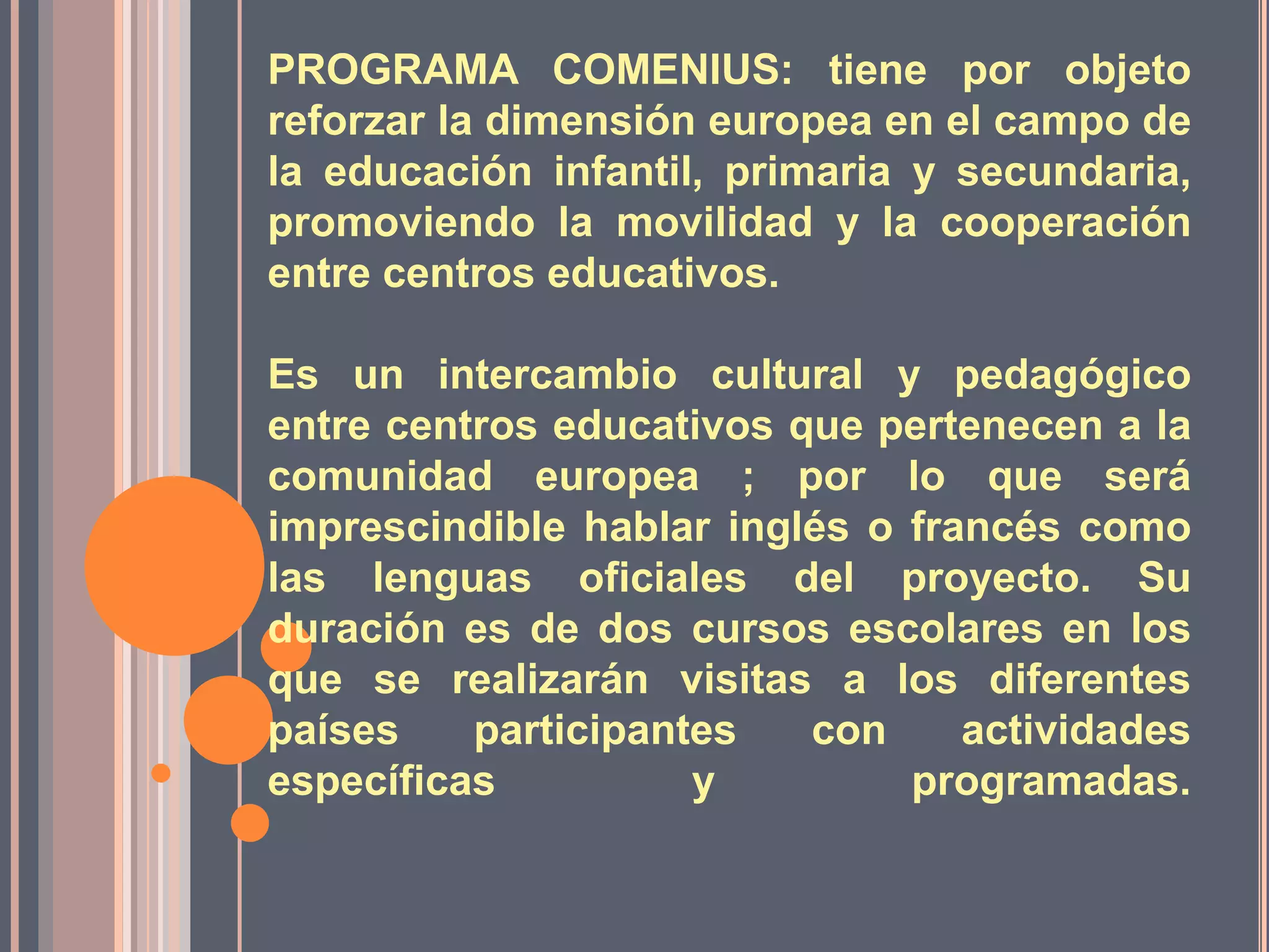 El documento describe un programa Comenius que involucra a centros educativos en Francia, Bélgica, Alemania, Italia, Grecia y España. El objetivo es promover la movilidad y cooperación entre los países a través de intercambios culturales y pedagógicos que incluyen visitas entre los participantes para realizar actividades programadas durante dos años escolares.