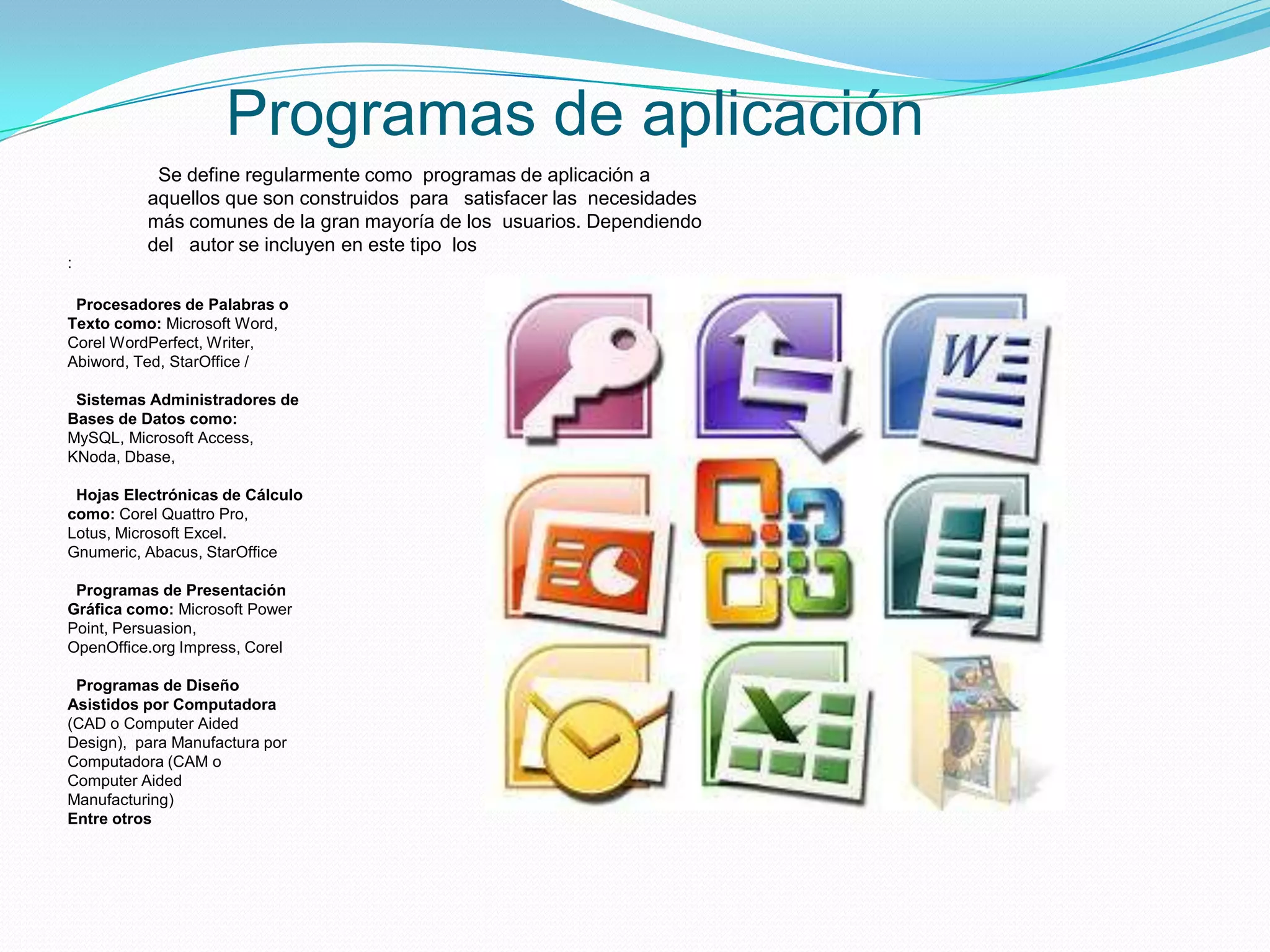 Este documento presenta una descripción general de diferentes tipos de programas de aplicación, incluyendo procesadores de texto como Microsoft Word, sistemas de bases de datos como Microsoft Access, hojas de cálculo como Microsoft Excel y programas de presentación como Microsoft PowerPoint. Explica brevemente el propósito y funcionalidad de cada uno de estos programas de aplicación populares.