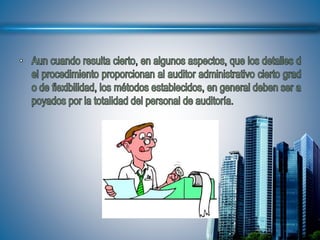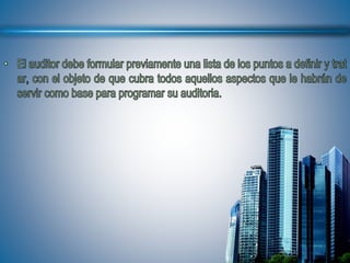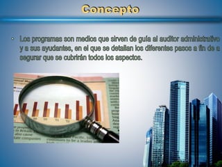 El programa de auditoría debe ser aprobado por el firmante del informe y puede ser preparado total o parcialmente por el encargado. Existen dos variantes: para estudios grandes, la concepción general y preparación son responsabilidad del encargado con revisión del gerente y aprobación del socio; para estudios pequeños sin gerentes, la concepción general está a cargo del socio, la preparación del encargado y la revisión y aprobación del socio. El programa debe incluir el propósito de la auditoría, las condiciones y limitaciones del trabajo, la estimación del