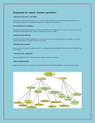 El documento describe tres funciones principales de los sistemas operativos: 1) la administración de la memoria, que supervisa el uso y disponibilidad de la memoria y asigna recursos a los procesos; 2) la recuperación de errores, que intenta prevenir la pérdida de control cuando ocurren errores en la entrada/salida de información; y 3) los programas de proceso, que incluyen utilerías del sistema, para archivos, e independientes para iniciar dispositivos y cargar el sistema operativo.