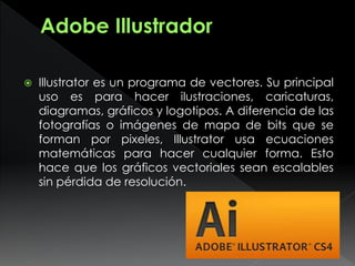 Illustrator es un programa de vectores que se usa principalmente para hacer ilustraciones, logotipos y diagramas. A diferencia de las imágenes de mapa de bits, Illustrator usa ecuaciones matemáticas para crear formas, lo que permite que los gráficos vectoriales sean escalables sin pérdida de resolución.