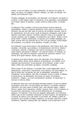 Este documento describe el programa de educación física para el primer grado. Explica que la educación física influye en todos los aspectos del ser humano y utiliza el movimiento corporal para desarrollar al individuo de manera integral. Además, describe los cuatro bloques de contenido del programa: juegos motrices, aptitud física, ritmo corporal y vida al aire libre.
