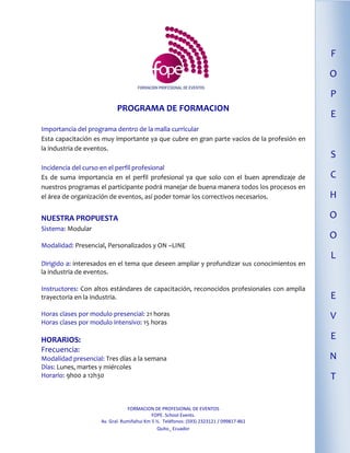 Este documento describe un programa de capacitación continua para profesionales de eventos ofrecido por FOPE School Events. El programa busca mejorar los estándares de la industria de eventos en Ecuador mediante la entrega de conocimientos y habilidades prácticas a través de módulos modulars presenciales, intensivos u online. El programa otorga certificaciones por módulo y como especialista luego de completar todos los módulos, prácticas y un proyecto final.