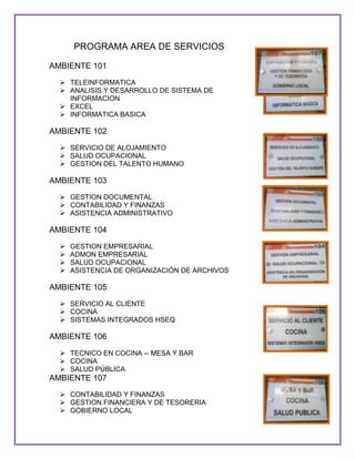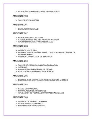El documento presenta una lista de 10 ambientes (107-116 y 201-306) que ofrecen diferentes programas y servicios relacionados con áreas como la salud, tecnología, administración, contabilidad, hotelería, cocina, entre otros. Cada ambiente incluye de 2 a 5 opciones de programas a desarrollar.