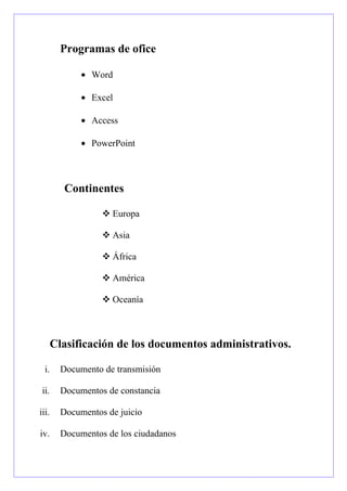 Este documento contiene información sobre programas de office como Word y Excel, los cinco continentes, la clasificación de documentos administrativos y herramientas para recuperar información en Internet. También incluye secciones sobre un informe sobre Internet y el mundo laboral, la búsqueda de empleo y formación, y el uso de bordes y sombreado en Word.